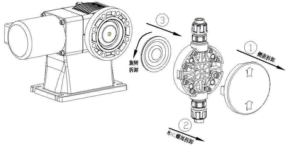 1. 在拆卸隔膜前必须将冲程长度调节旋钮调节到零位